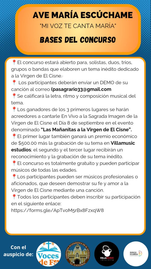 Voces de Fe te invita a participar del concurso «Ave María Escúchame» Mi voz te canta María. Un concurso dirigido a músicos y compositores que deseen demostrar su amor a la Churonita, mediante una canción. ¿Estas preparado? Inscríbete en el siguiente enlace: