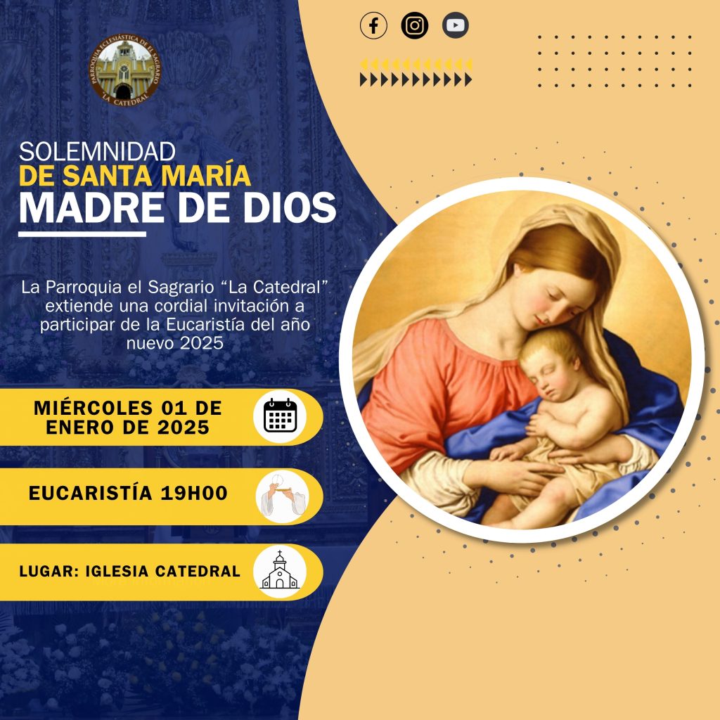 Miércoles 01 de enero de 2025 Solemnidad de Santa María, Madre de Dios, Llenos de alegría al recibir un nuevo año participemos de la Santa Eucaristía a las 19H00.