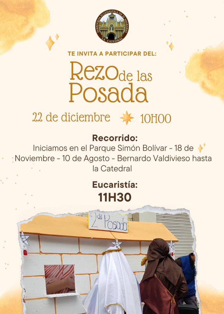 Domingo 22 de diciembre a las 10H00: Rezo de las posadas con la Catequesis Familiar; iniciamos en el Parque Simón Bolívar – 18 de Noviembre – 10 de Agosto – Bernardo Valdivieso – hasta llegar a la Iglesia Catedral donde se celebrará la Santa Eucaristía a las 11H30.
