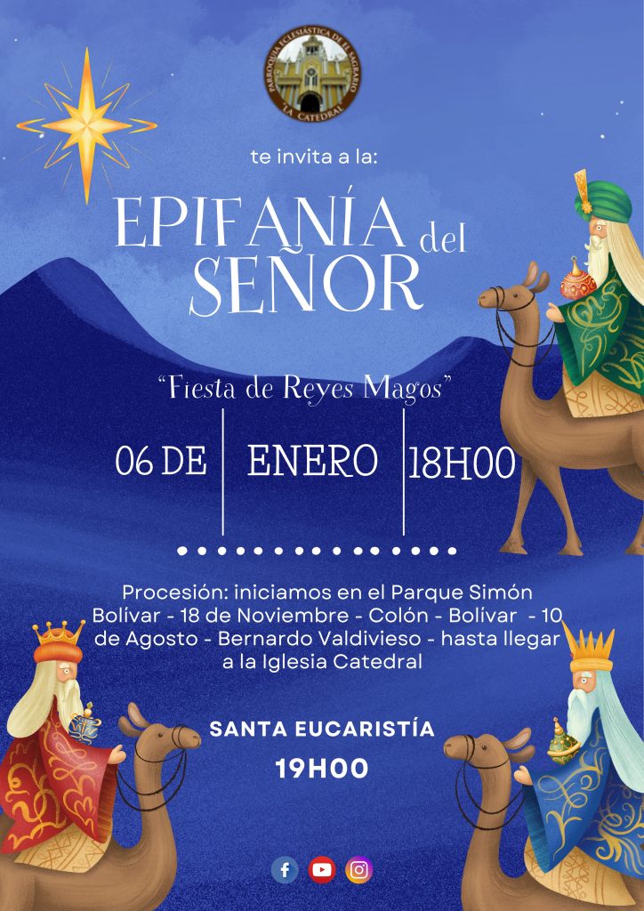Los priostes de la Fiesta de Reyes Magos, invitan a todos nuestros hermanos a participar del “Pase del Niño” el lunes 06 de enero de 2025 a las 18H00. Iniciamos en el Parque Simón Bolívar – 18 de Noviembre – 10 de Agosto – Bernardo Valdivieso – hasta llegar a la Iglesia Catedral, a las 19H00 se realizará la Santa Eucaristía.