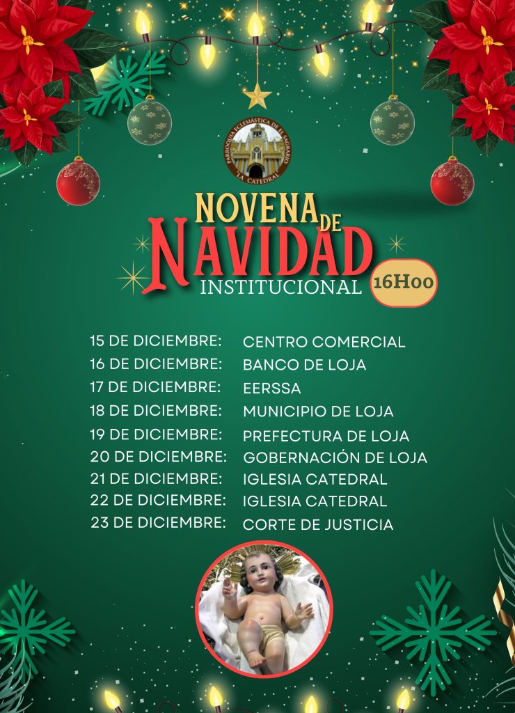 Del 15 al 23 de diciembre se realizará la Novena de Navidad Institucional con la Eucaristía de 16H00, luego de ello se realizará el «Pase del Niño» hasta las diferentes instituciones.